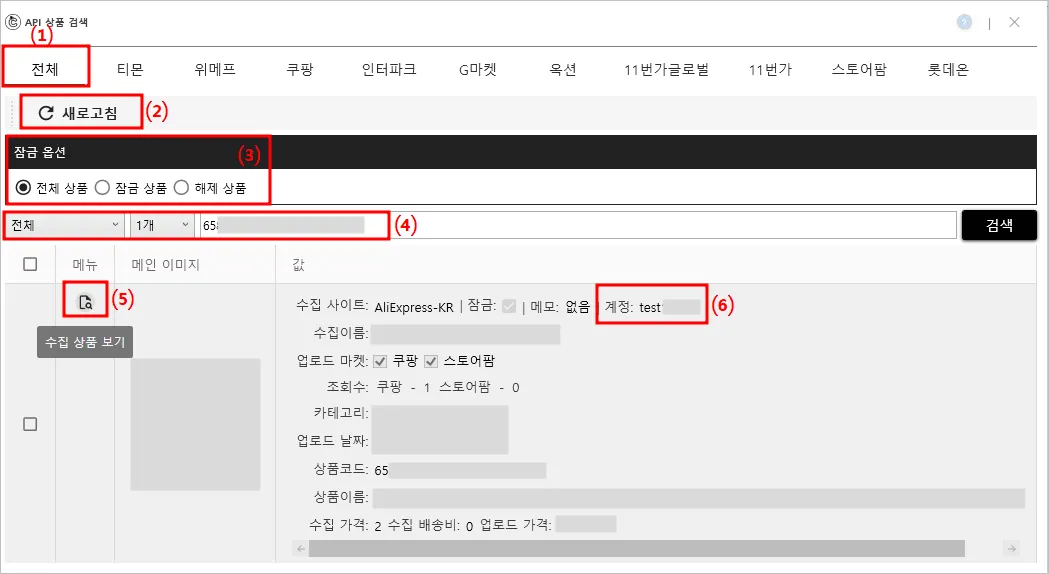 창 설명 : 업로드 API를 연동한 계정으로 올린 상품을 상품 코드, 상품명, 카테고리 등을 통해서 검색