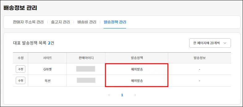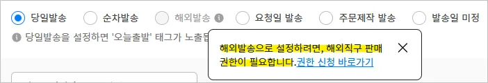 ‘사업자 판매회원’ 유형으로 가입한 국내 셀러는 반드시 해외직구 판매 권한을 받아야 해외발송 선택이 가능합니다.