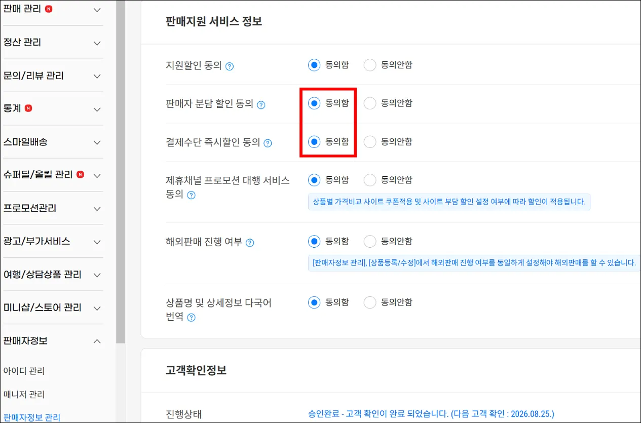 지원할인 동의, 제휴채널 프로모션 대행 서비스 동의 사항은 판매자 가입할 때 동의한 상태
