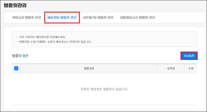 옥션&G마켓 배송 템플릿 설정 시, [배송정보 관리] - “대표” 설정 칸에 반드시 체크!