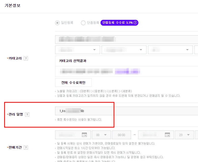 관리 딜명 : 판매자가 상품 관리 목적으로 사용하는 상품명