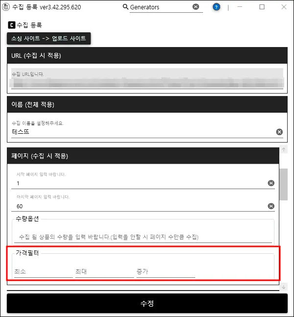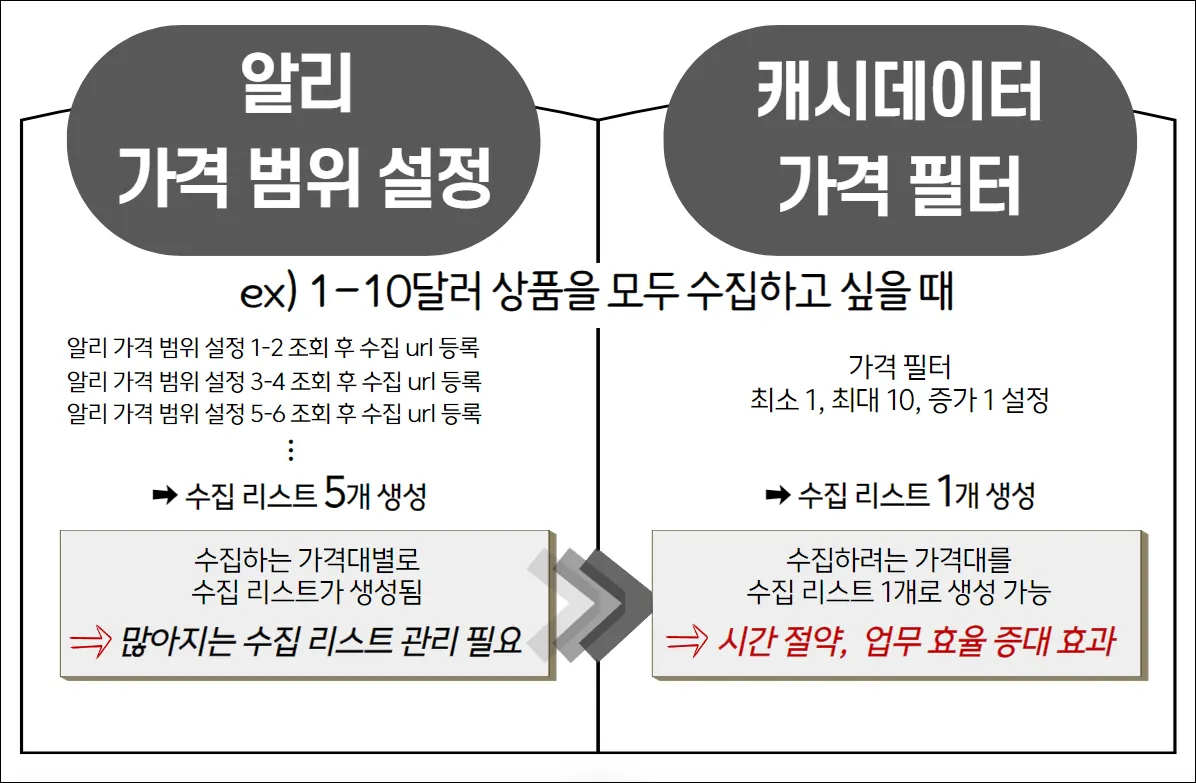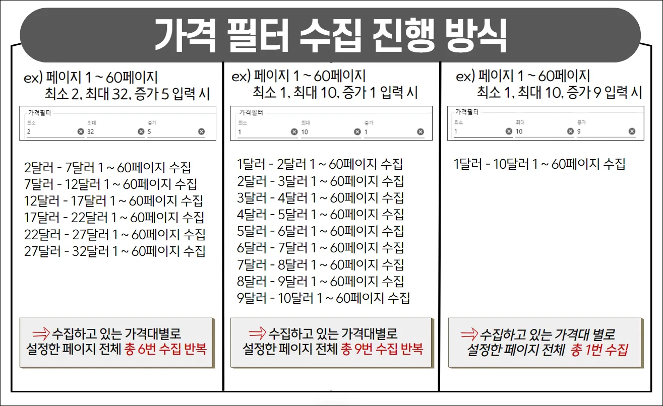 : 수집 리스트 1개 내에서 설정한 가격대(=가격 필터 증가식)의 알리 상품을 전부 수집할 수 있는 기능
