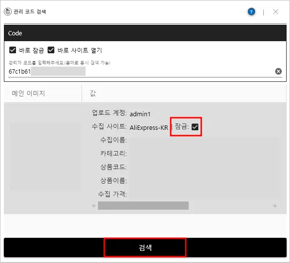 3. 검색 버튼을 클릭하면, 검색 결과에 나온 모든 상품이 잠금 설정됩니다.