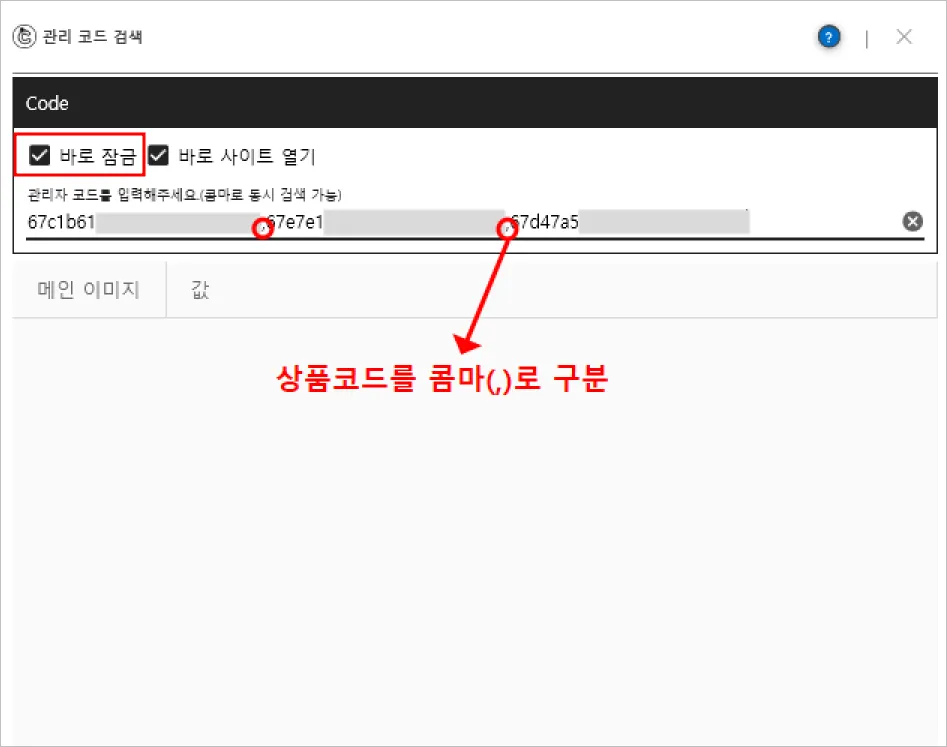 2. 바로 잠금에 체크한 뒤, 주문 들어온 여러 개의 상품 코드를 콤마(,)로 구분하여 입력합니다.