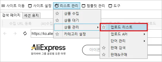 1. [리스트 관리] - [상품 관리] -[업로드 리스트]를 클릭합니다.