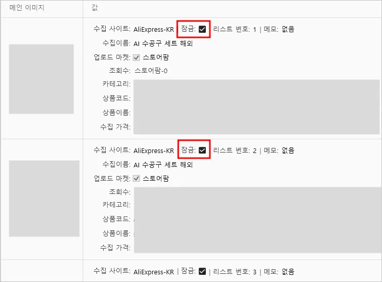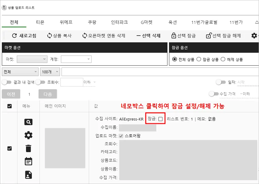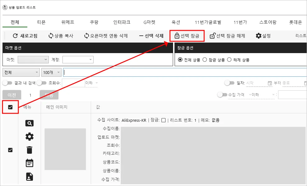 2. 상품 업로드 리스트에서 잠금 설정할 상품을 전체 선택 후