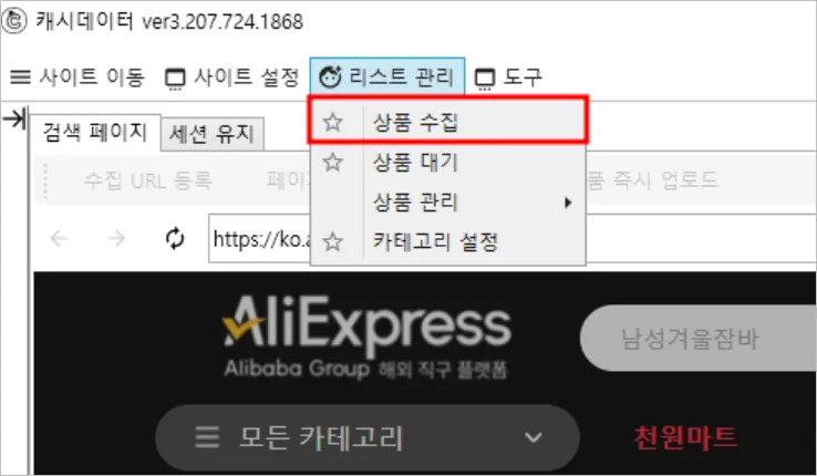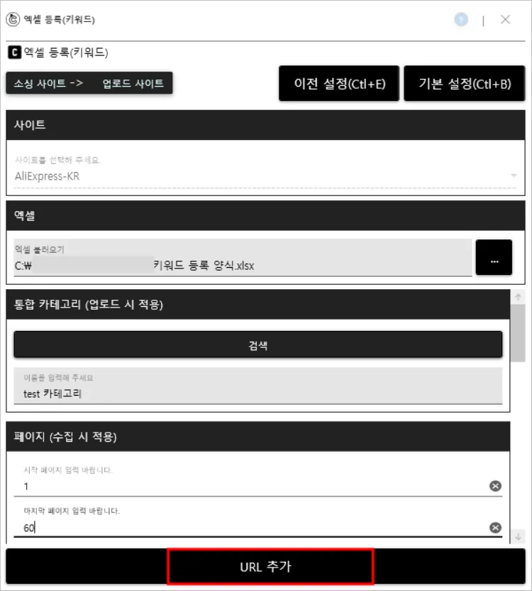 검색 키워드(필수) : 알리익스프레스 ‘검색 키워드’를 통해 검색한 결과가 수집 URL로 생성