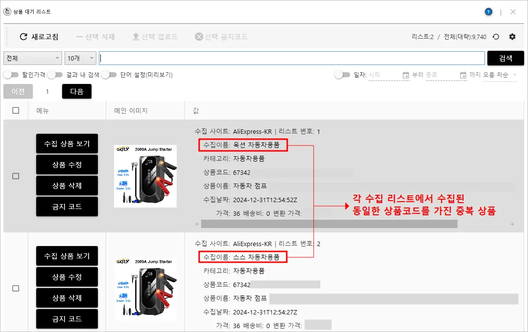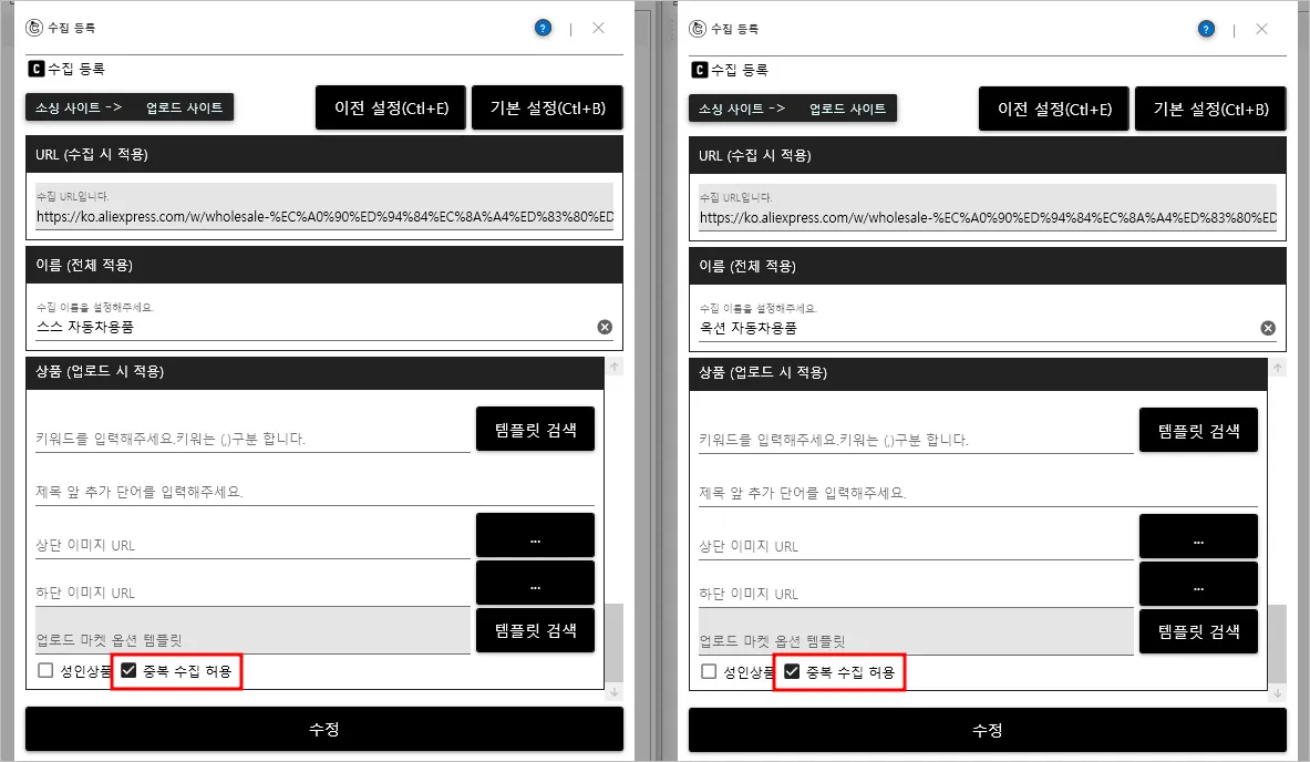 : 상품을 중복으로 수집 및 업로드할 수 있는 기능