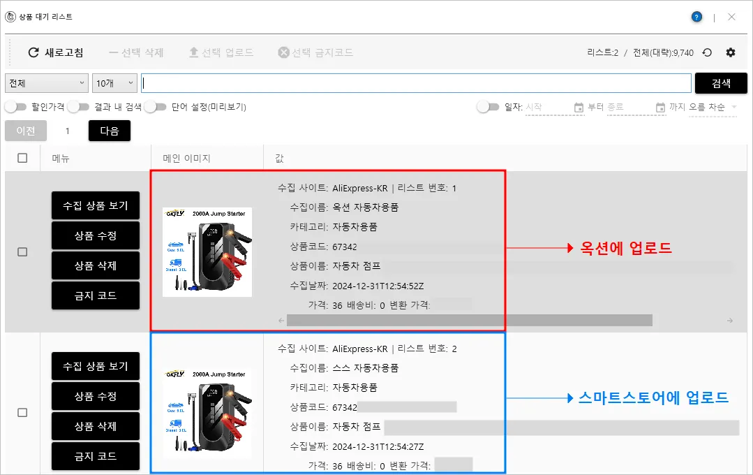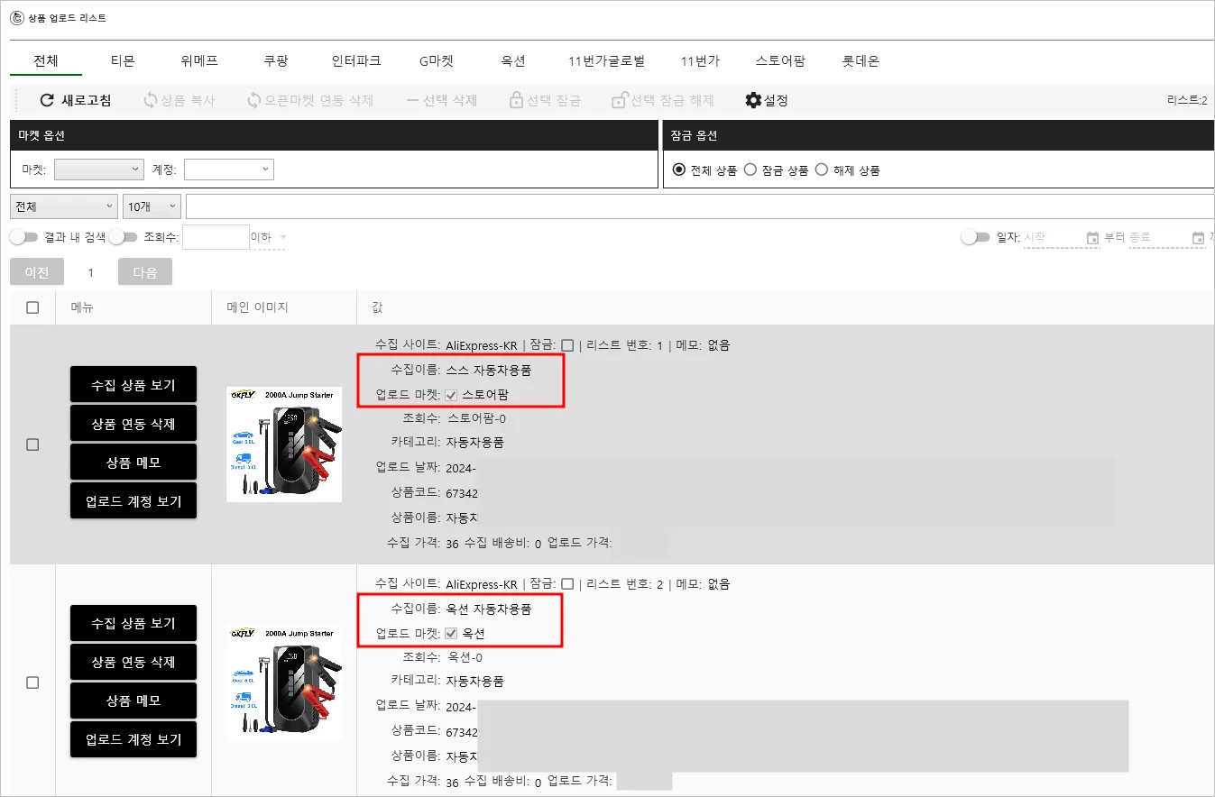 업로드 : 각 수집 리스트의 동일 상품을 옥션, 스마트스토어에 업로드하는 상황