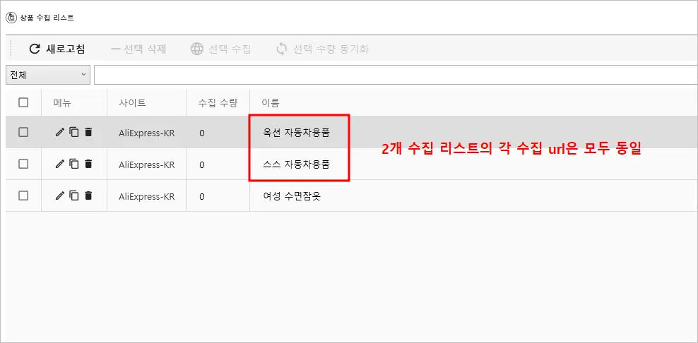 수집 리스트 1개 안에서 같은 상품을 2번 중복으로 수집할 수 없습니다.