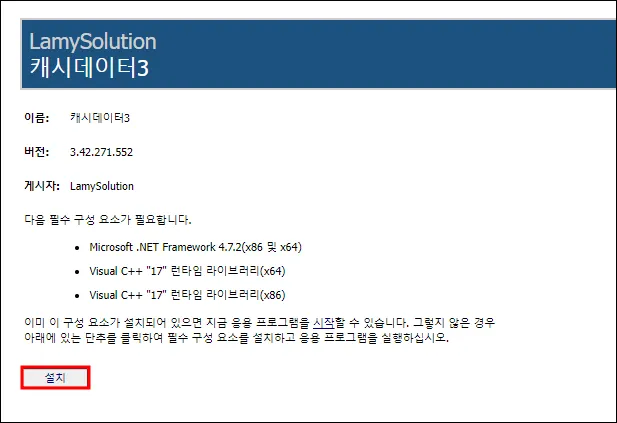 2회 설치 진행 → 재부팅 → 바탕화면 캐시데이터 아이콘 실행 → 정상 구동