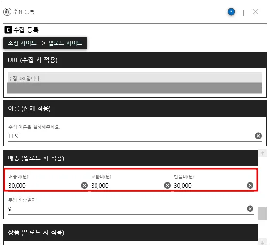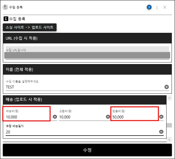 수집 등록 창에서 설정한 반품 배송비가 배송비 자동 옵션보다 우선 적용