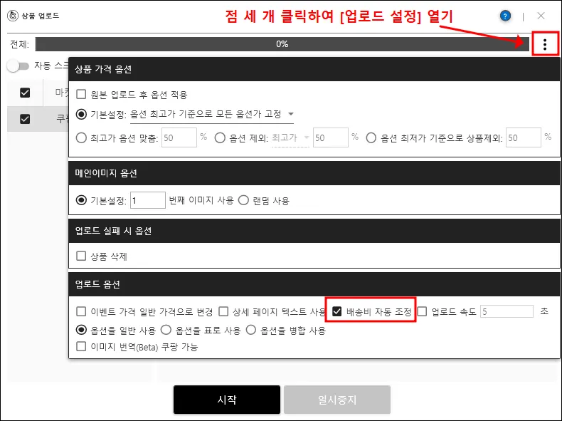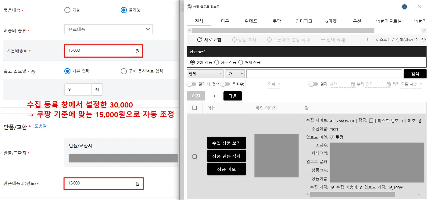 2) 마켓 기준에 맞지 않으면 배송비 자동 조정하여 업로드