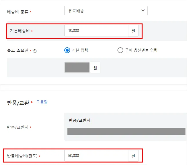 (5,000 ~ 10,000원 내에서 설정이 가능하다면 반품 배송비 10,000원으로 업로드)