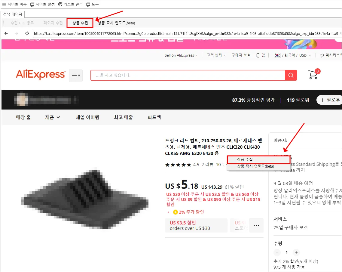 상품 페이지 내 [마우스 우클릭] - 상품 수집 클릭