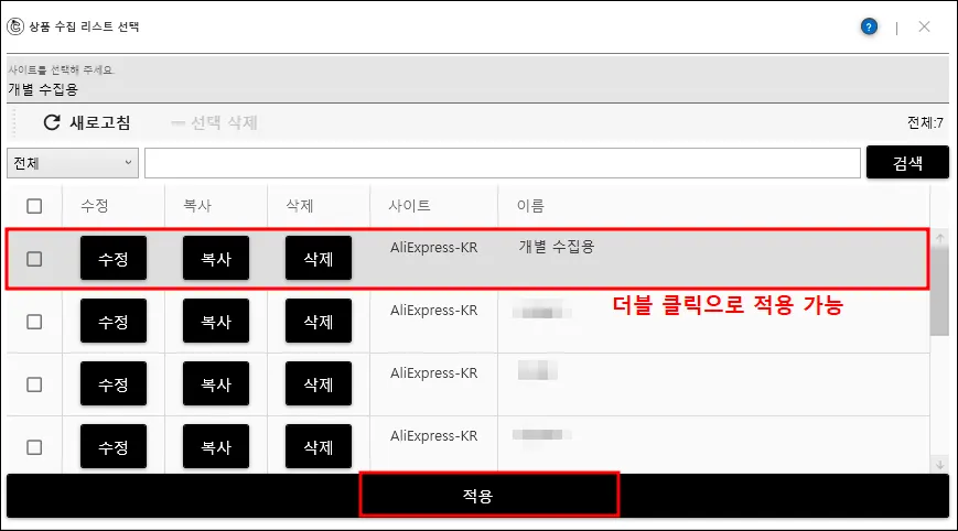 개별 상품 수집 시 상품 수집 전 적용할 수집 리스트를 미리 생성해야 합니다.
