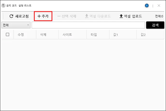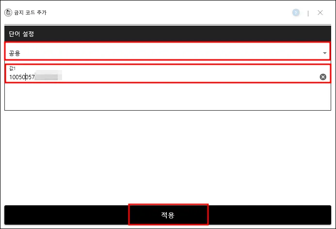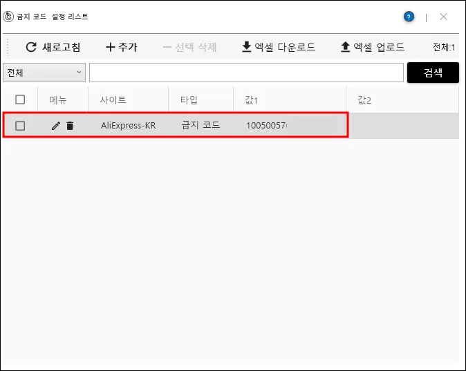 금지 코드 설정 리스트에 상품 번호/코드가 추가됨