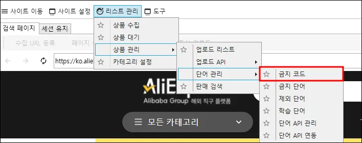 상단 선택 금지코드 or 상품 메뉴 금지 코드를 클릭
