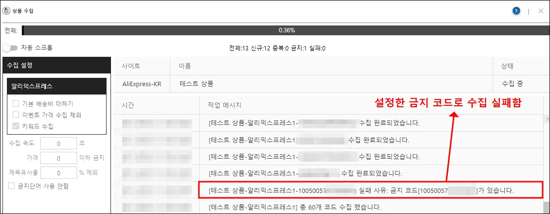 2. 확인을 클릭하면 대기 리스트에서 금지 코드로 설정한 상품은 즉시 삭제되며,