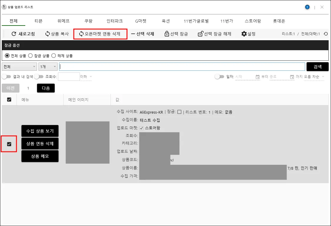 해당 기능 체크 시 연동 삭제에 성공한 상품이 (업로드 리스트+마켓)에서 삭제됨과