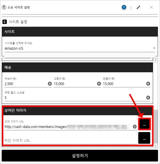 1. 왼쪽 상단에 [사이트 설정] - [소싱 사이트] - [설정]을 클릭합니다.