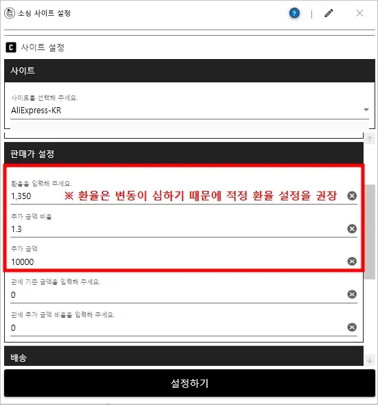 판매가 = (원가 x 환율 x 추가 금액 비율 x 관세 추가 금액 비율) + 추가금액