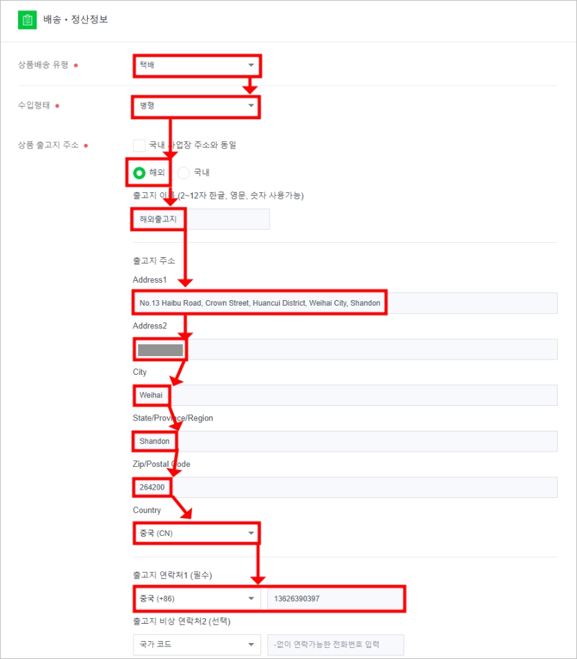 상품 출고지 주소는 배대지 주소를 입력합니다.