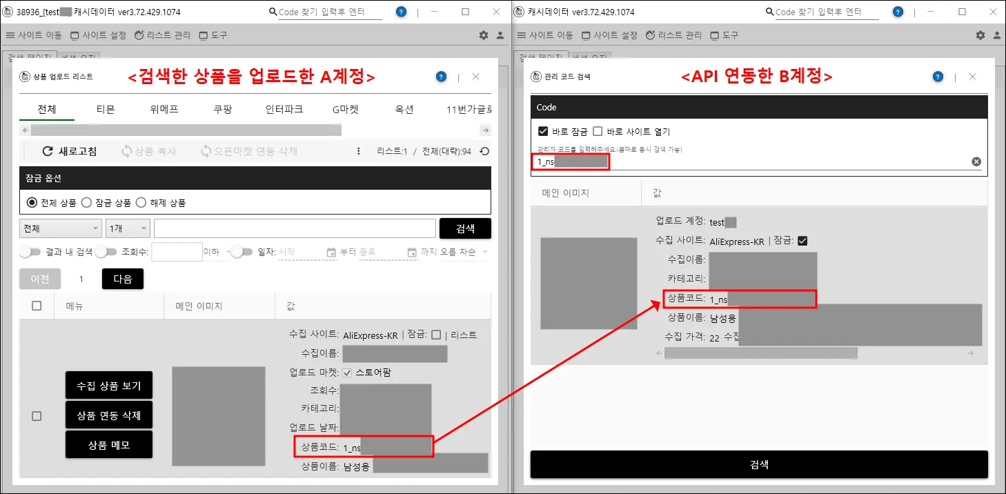 (필수) 정확한 업로드 API로 연동되어 있는지, 지금 검색하는 상품이 연동한 API의 계정으로
