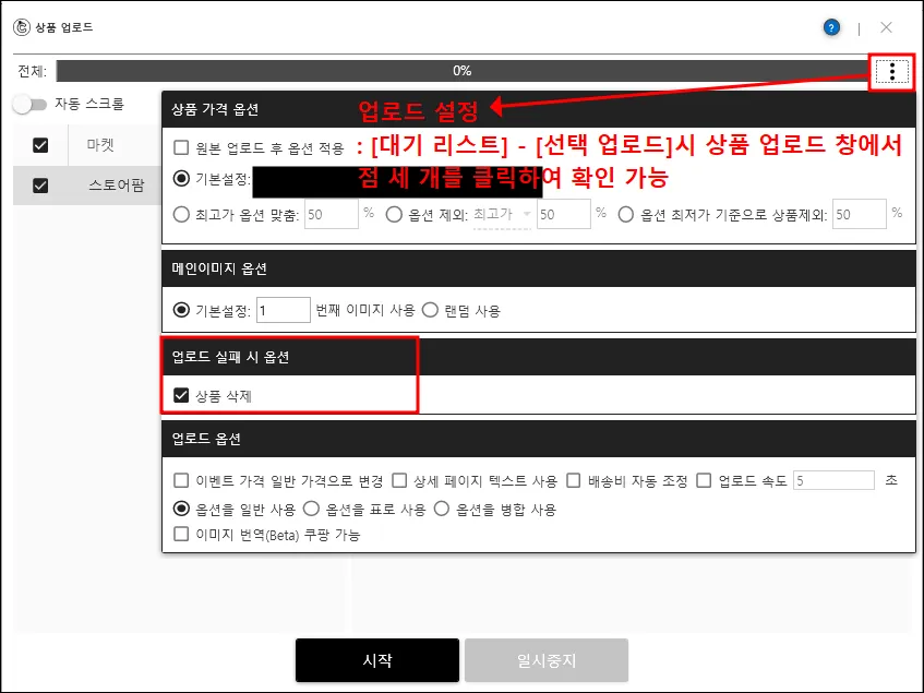 업로드에 실패한 상품은 대기 리스트에서 자동으로 삭제되는 업로드 설정