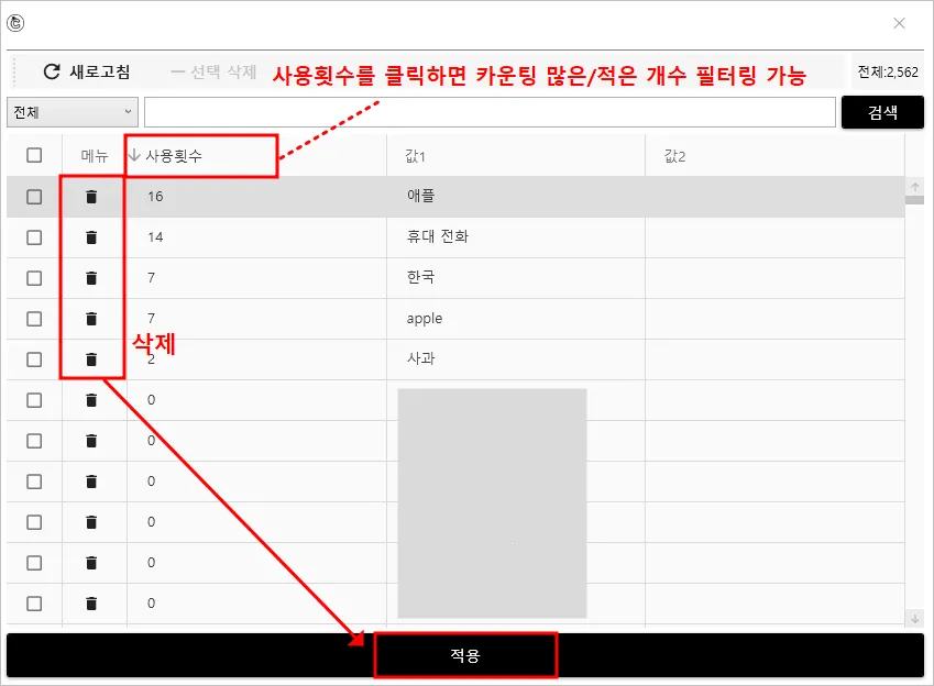 단어 리스트 설정 창에서 삭제한 단어는 반드시 [Enter] or [적용] 버튼을 눌러야 리스트에서 정상 제거됩니다.