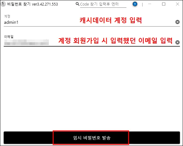 2. 캐시데이터 계정/계정 회원가입 시 입력했던 이메일을 기입한 후,