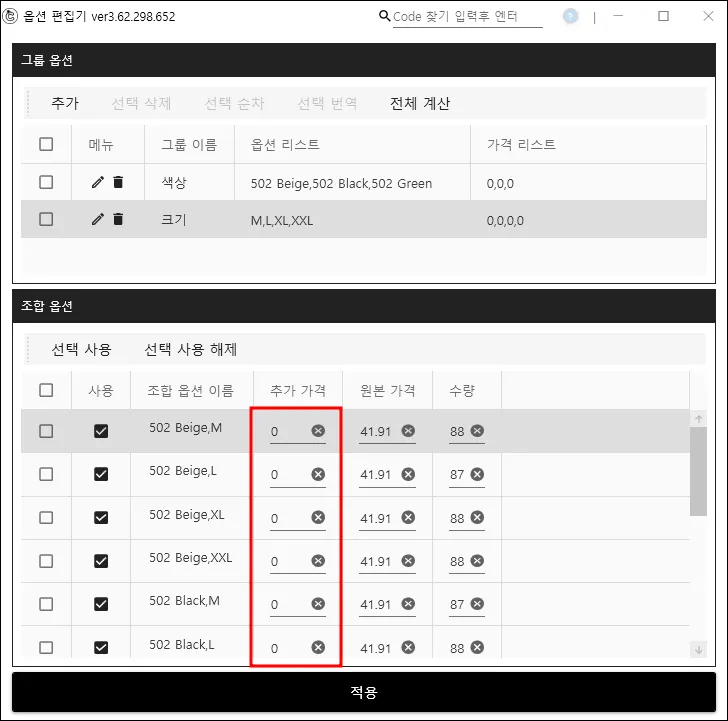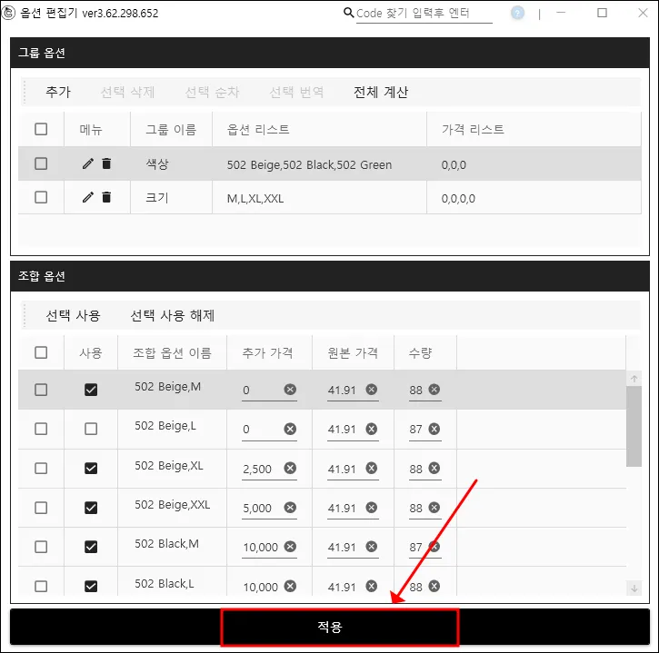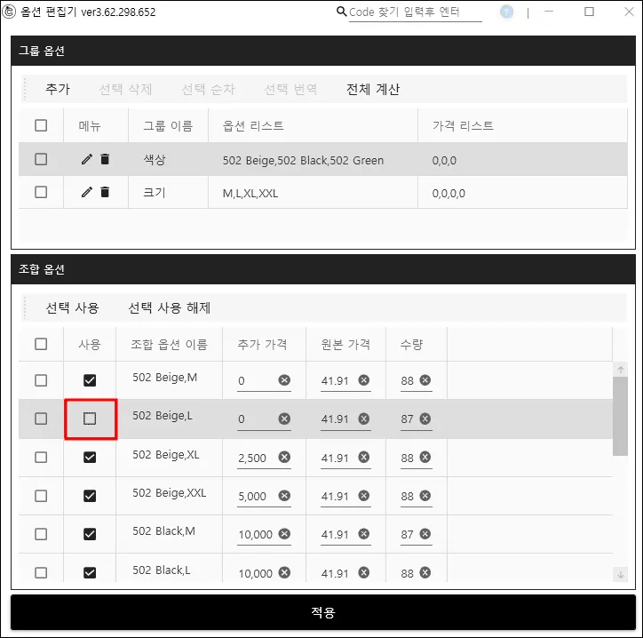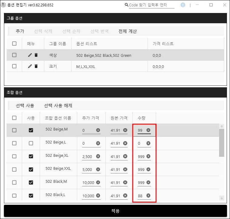 3. 옵션 그룹 편집기 창에서 한번 더 적용 클릭