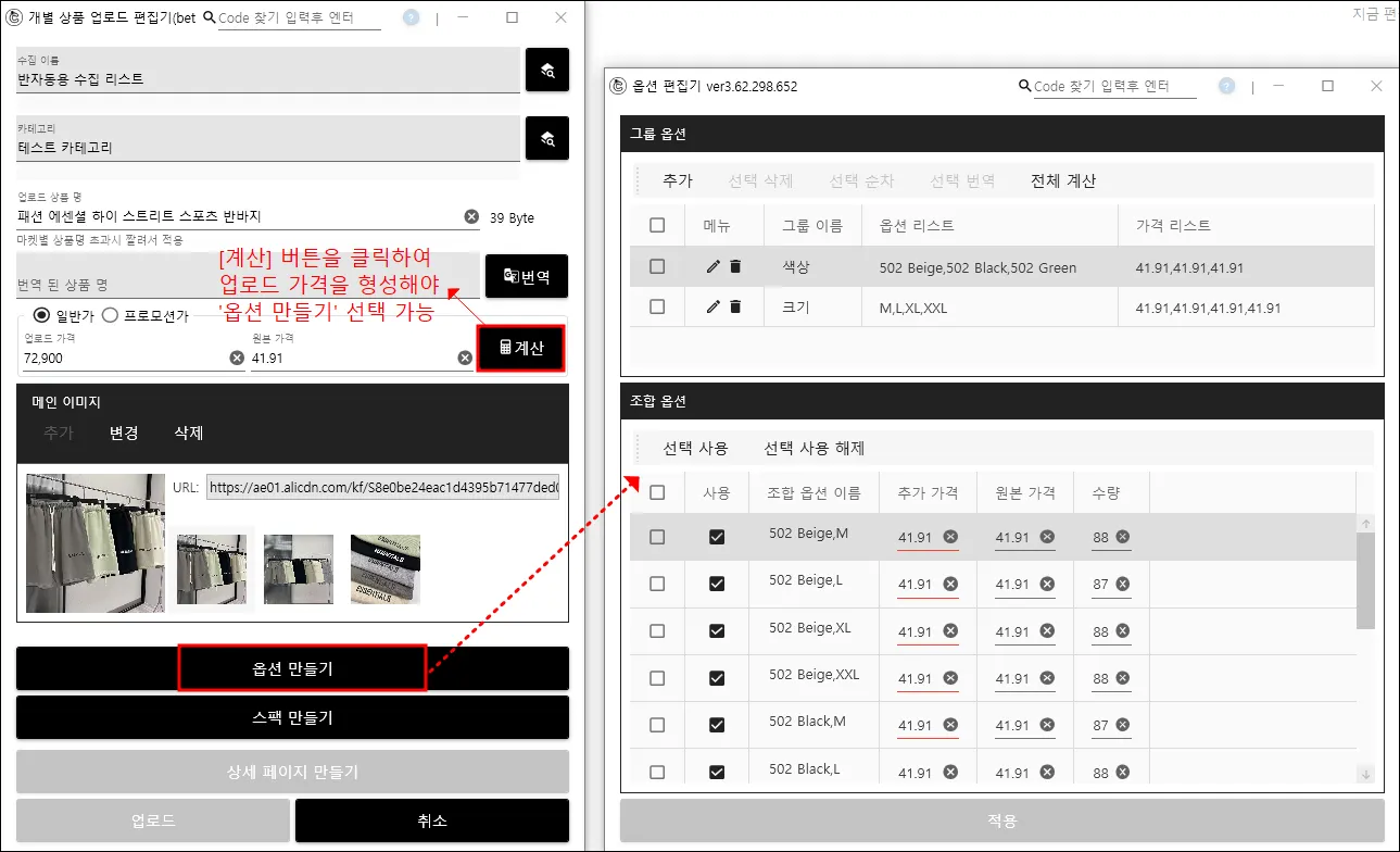 [개별 상품 업로드 편집기] 창에서 옵션 만들기를 클릭하여 [옵션 편집기]창에 접속 반자동 기능 전체 과정 중 8번 이후 순서