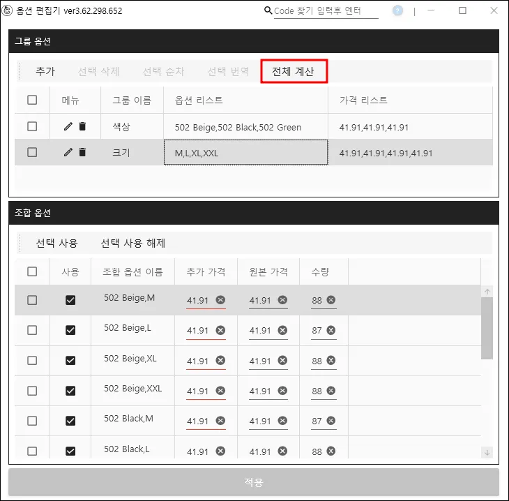 전체 계산을 클릭하여 옵션 원본 가격에 대한 추가 가격을 생성 원본 가격 : 소싱 사이트 환율 기준 (ex. 달러, 엔화 등) 추가 가격 : 한화 기준