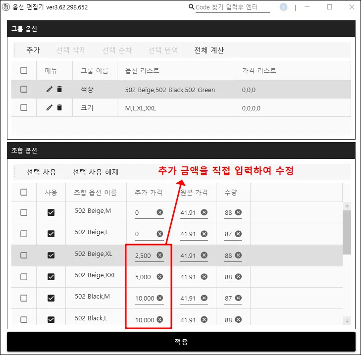추가 가격을 수정하고 싶은 옵션은 [조합 옵션]의 추가 가격 설정