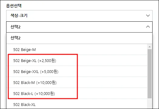 <실제 마켓에 업로드 된 옵션 추가 가격>
