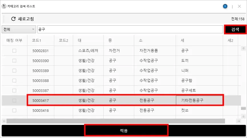 7. 카테고리명을 검색하여 원하는 카테고리를 선택 후 적용을 클릭합니다.