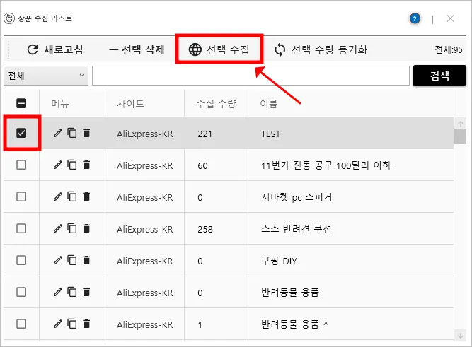 16. 생성한 수집 리스트를 체크하여 선택하고, 선택 수집을 클릭합니다.