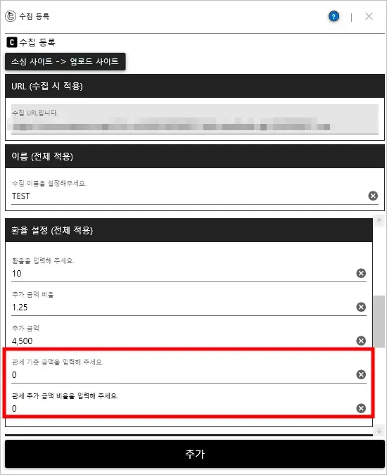 관세 기준 금액, 관세 추가 금액 비율을 설정하지 않으려면 1/1, 0/0을 입력