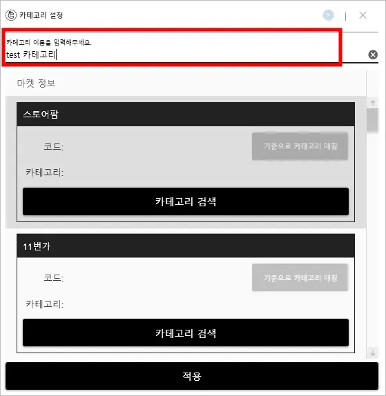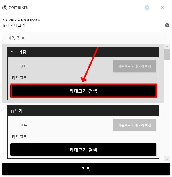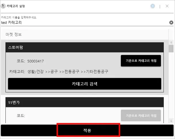 [카테고리 설정] 창 : 업로드 할 마켓의 카테고리를 매칭