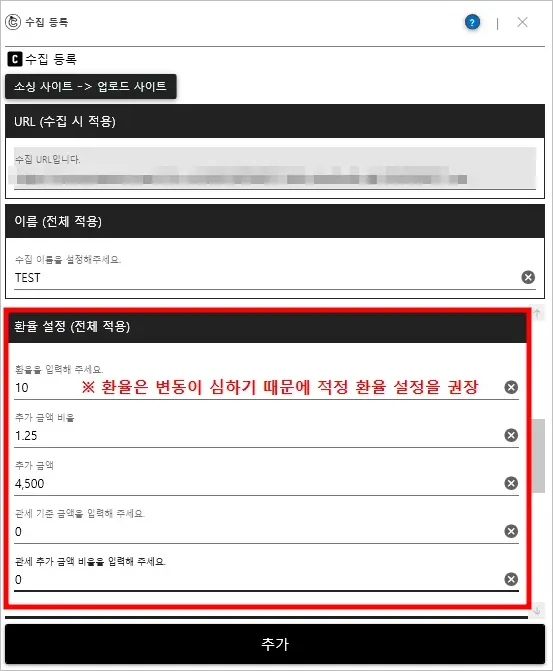 10. 환율/추가 금액 비율/추가 금액/관세 기준 금액/관세 추가 금액 비율을 입력하여