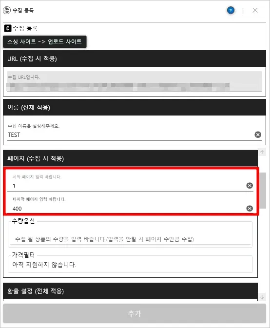 수량 옵션 : 수집할 상품의 총 수량을 제한 설정하는 기능