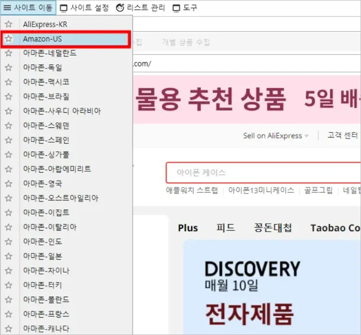 1.  [사이트 이동] - [Amazon-US]를 클릭합니다.