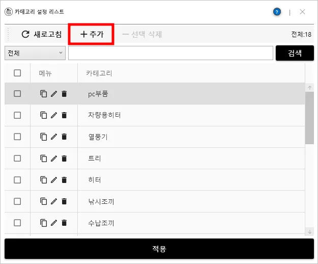 5. 추가 버튼을 눌러 카테고리 설정 리스트를 생성합니다.