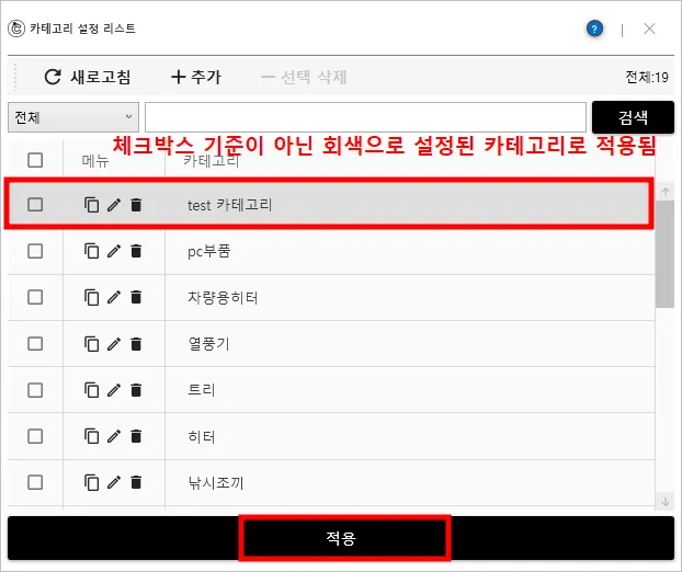 8. [카테고리 설정]창에서 적용, [카테고리 설정 리스트]창에서 적용을 클릭합니다.