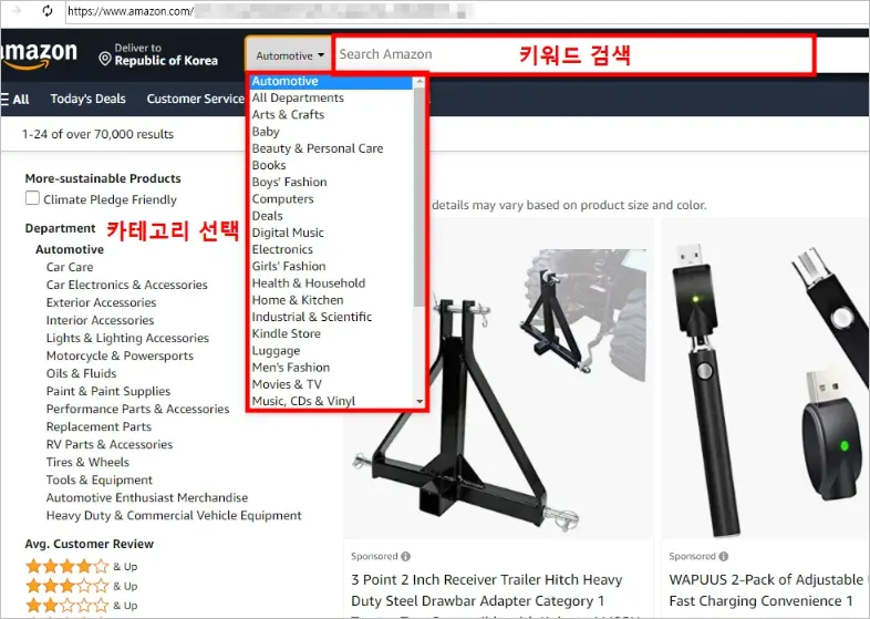 2. 카테고리 선택 or 키워드 검색을 통해 원하는 상품 페이지 화면으로 이동합니다.