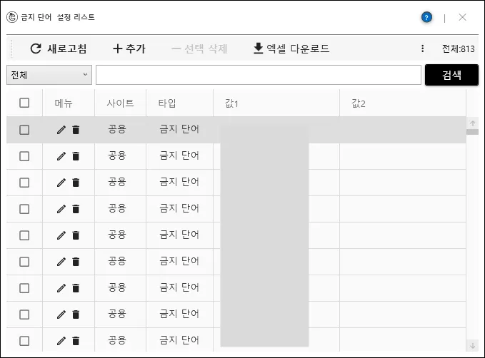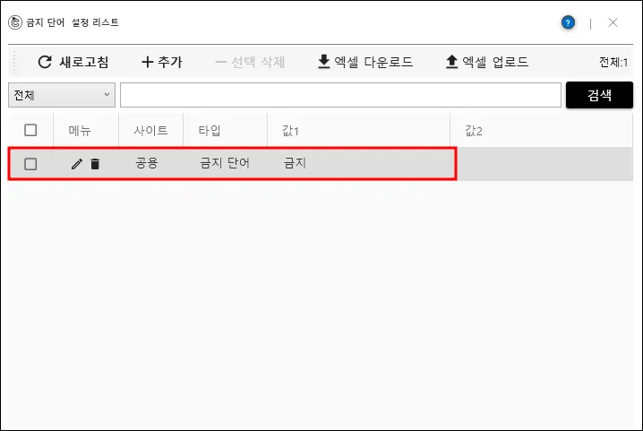 다시 [엑셀 업로드]하면 기존에 등록되어 있던 금지 단어는 중복으로 거르고, 새로 설정한 금지 단어만 최종 업로드