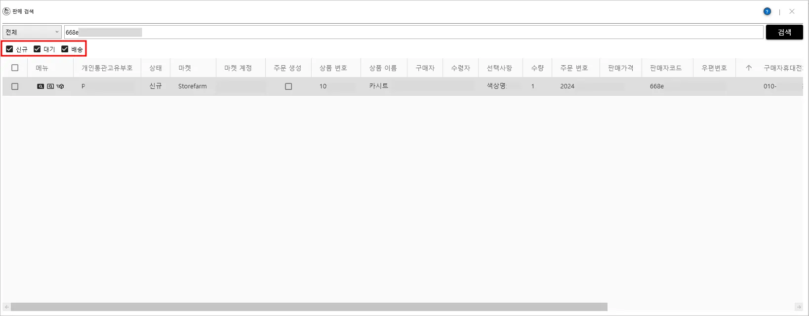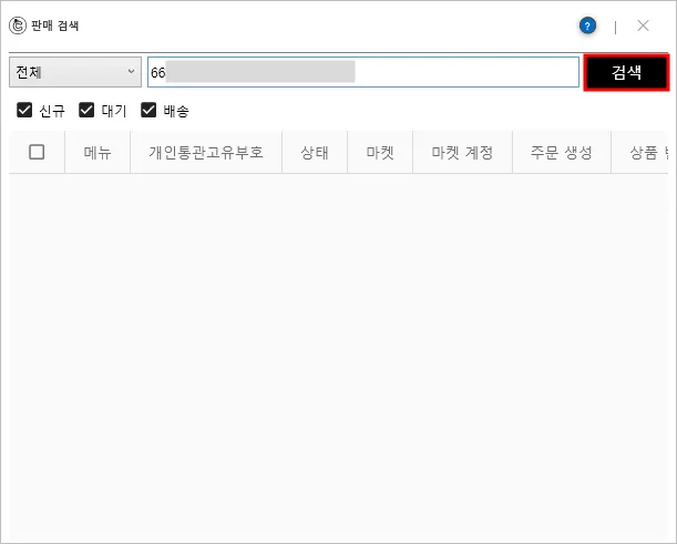 □신규 □대기 □배송 란에 체크 해제된 주문건은 검색되지 않습니다.