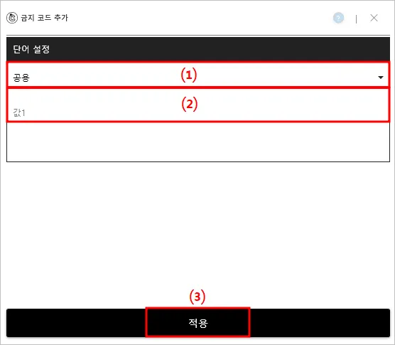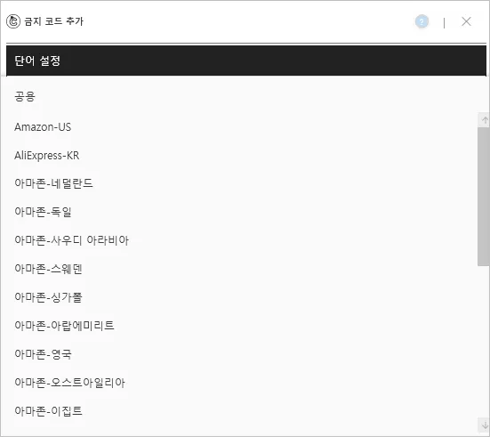 창 접속 방법 : [리스트 관리] - [상품 관리] - [단어 관리] - [금지 코드] - [+추가]