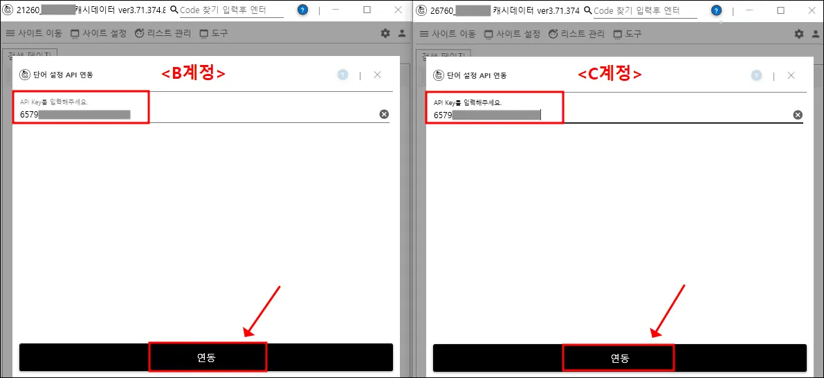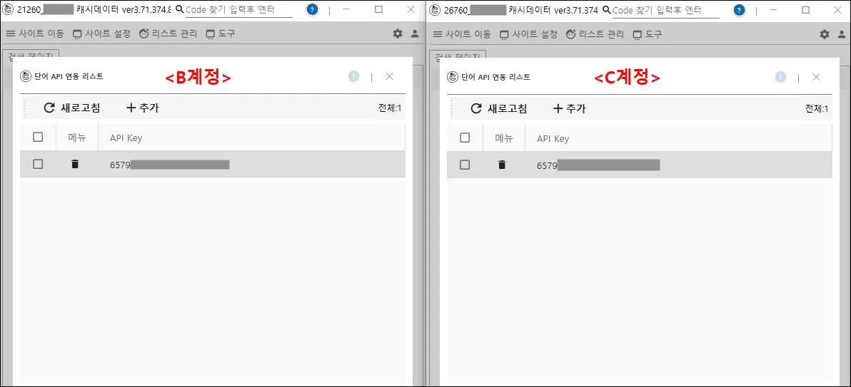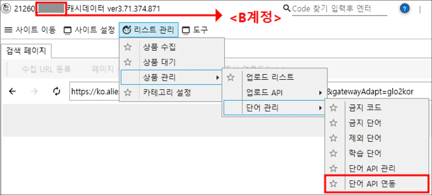 한 개의 계정(A계정)에서 다른 캐시데이터 계정(B계정)의 단어 설정을 연동할 수 있는 기능